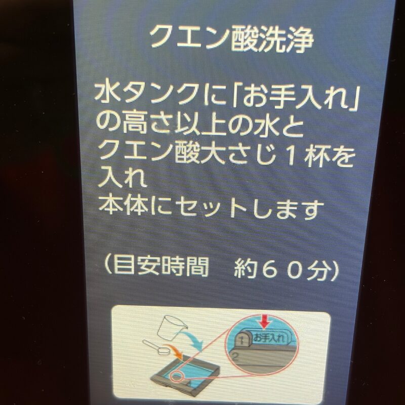 ヘルシオを愛用していると、ある日突然画面に現れる「クエン酸洗浄をしてください」の文字